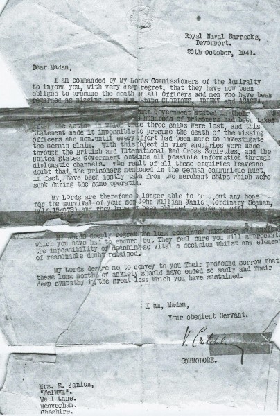 Dedicated to perpetuate the proud memory of the men serving in HM Ships Glorious, Ardent & Acasta who lost their lives in the Norwegian Sea on 8th June 1940 and those who survived